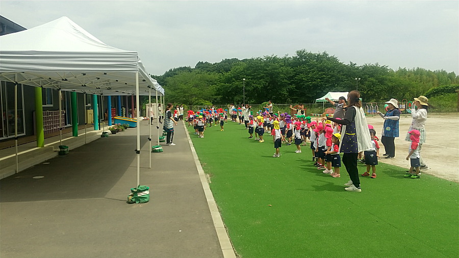 登園後の外遊び、曇り空の中、盆踊りの練習。この後、全員でアイスキャンデーを食べました。もも・さくらんぼ組、年長組が体操教室、他制作等をしています。