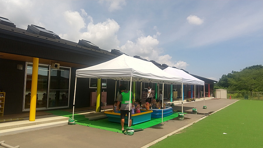 黒調の園舎に映えます。本日もプール・水遊びで歓声がこだましています。