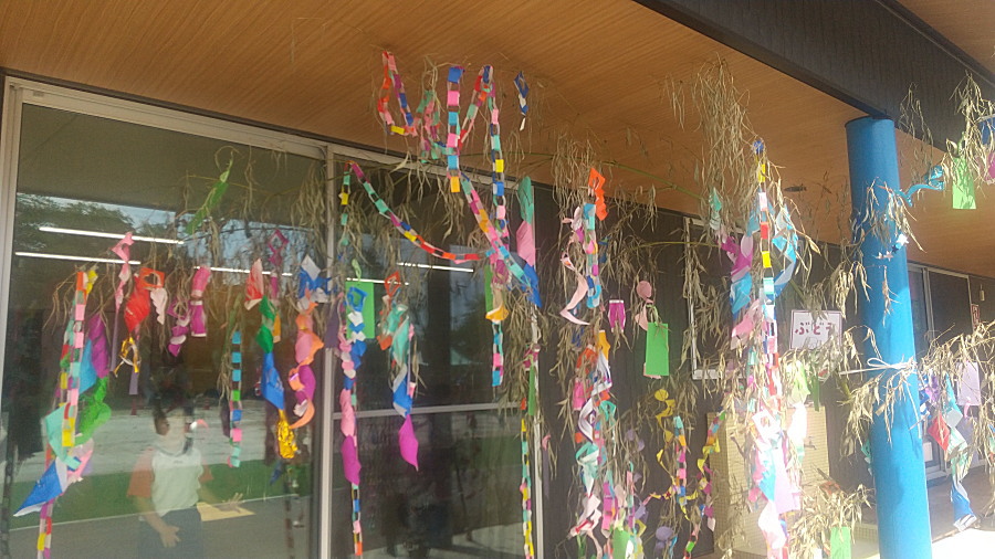 ちなみに五色の短冊にはそれぞれの意味が込められています。江戸時代頃に一般に広まったようで、「緑・青」は健康や人間的な成長。「赤」は先祖や親戚への感謝。「黄」はお金や人間関係。「白」はがんばりたいこと。「黒(紫)」は学業の向上です。さて各学年の笹飾りをご覧ください。