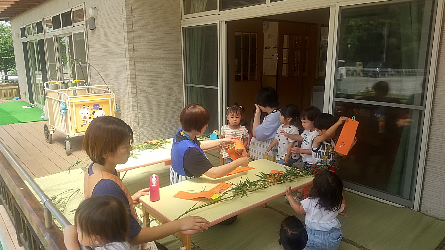 「ささのは さらさら~♪」BGMが流れる中、笹飾りを行いました。