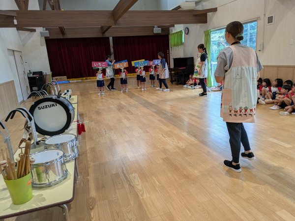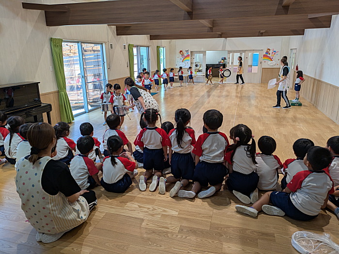 年中組が見守る中、年長組リトルバンドが入場。「よ~く、見ておいてね」声掛けしました。