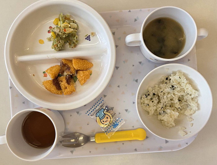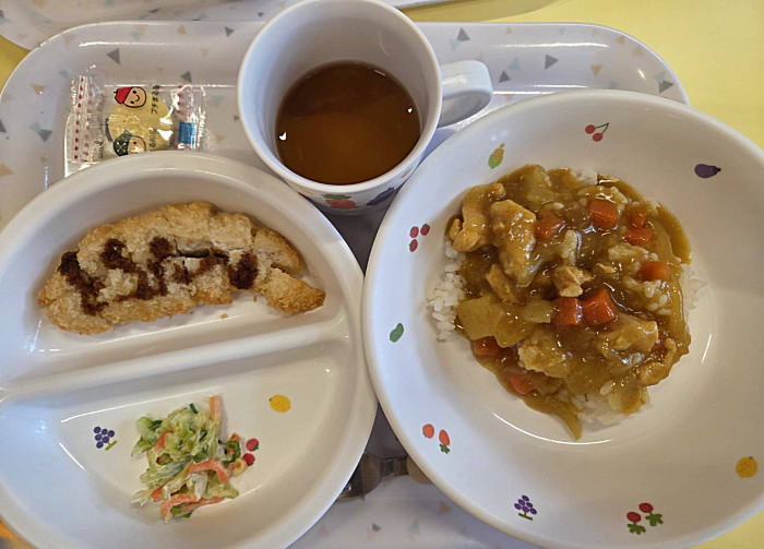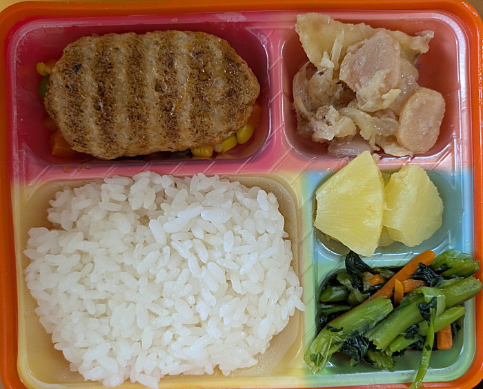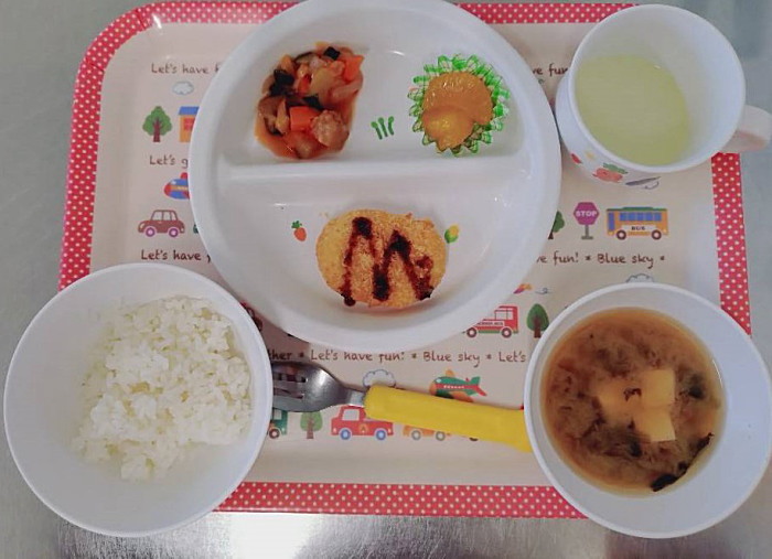 本日のにこにこ棟給食です。全クラス、保育室、体育館で少しずつ、運動会種目を取組んでいます。