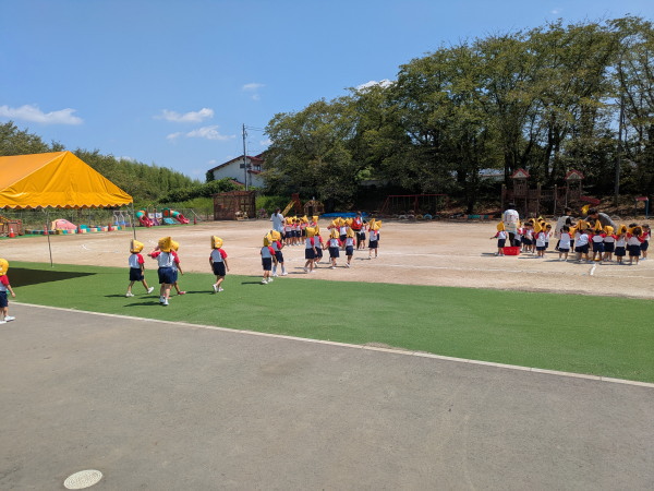 午前中の早い時間帯は幾分、空気の変りを感じる連休明け。園庭で全クラス、運動会競技練習行いました。また給食後、帰りの時間帯迄、体育館は団体競技練習など、がんばっています。