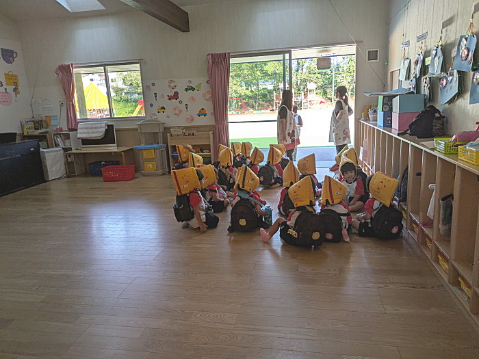 地震避難訓練を行いました。保育室で身をかがめて揺れが収まり次第、園庭に集合。人数確認のみして、すぐさま保育室にて担任がいろいろな注意事項を話しました。