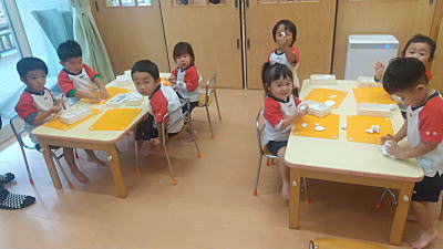 ぽかぽか棟を訪れましたら、あんず組が粘土あそびをしていました。もも組はにこにこ棟、全員トイレタイムでした。