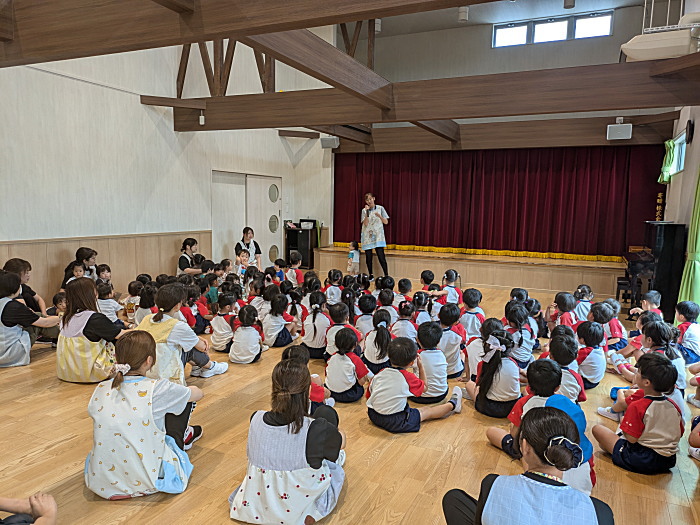 猛暑の中の2・3号保育ですが、プール、水遊びを楽しんだり、体育館では盆踊りの練習をしています。皆、元気ですよ。あすは年長組お泊り保育です。楽しんできましょう。