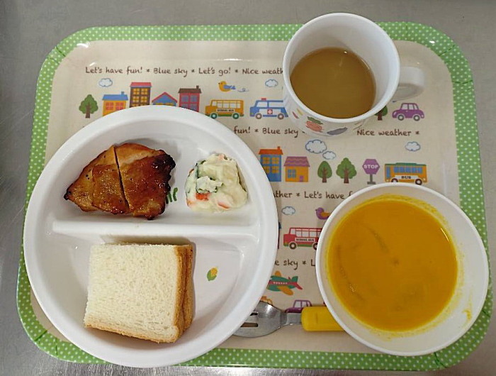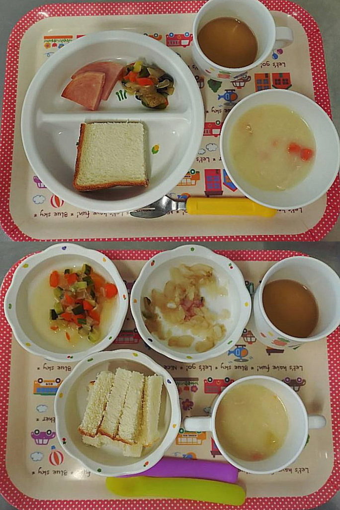 ぽかぽか棟給食です。きょうから離乳食が普通食になりました。