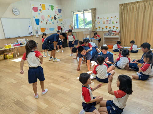 夏季保育が始まりました。出席率も良いです。台風の影響で幾分気温が低く、年長組は給食前に園庭でリレー練習をしました。また体育館でもおみこし担ぎも行っています。可愛いおみこし、お見せしたい気持ちですが、夏祭りをお楽しみに。