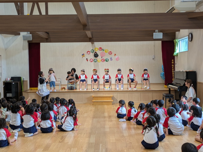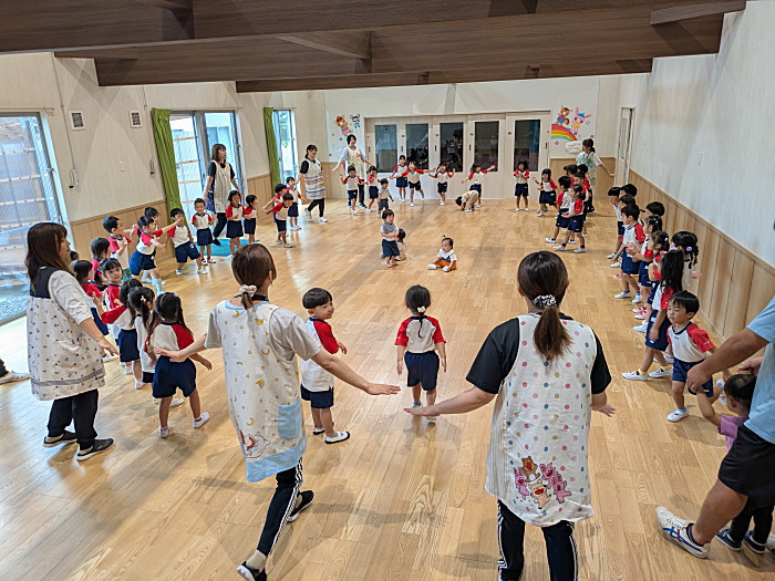 0.1歳児、3.4歳児が集まって盆踊りの練習しています。台風の影響も少ないようで良かったです。