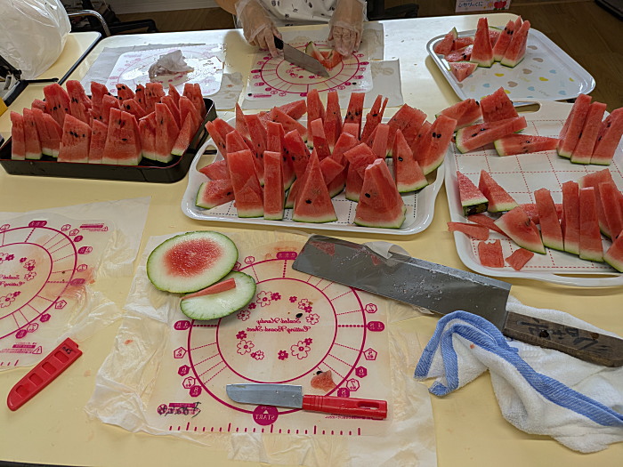 昨日までの暑さがウソのような涼しさです。お陰で園庭でゆっくりと笹焼き、盆踊りの練習ができました。