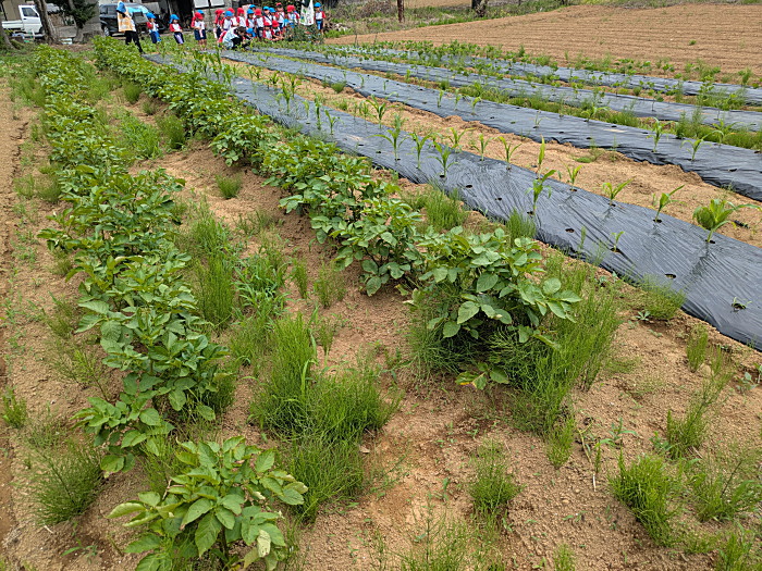 野菜畑もご覧のように。年長組が観察に来ました。