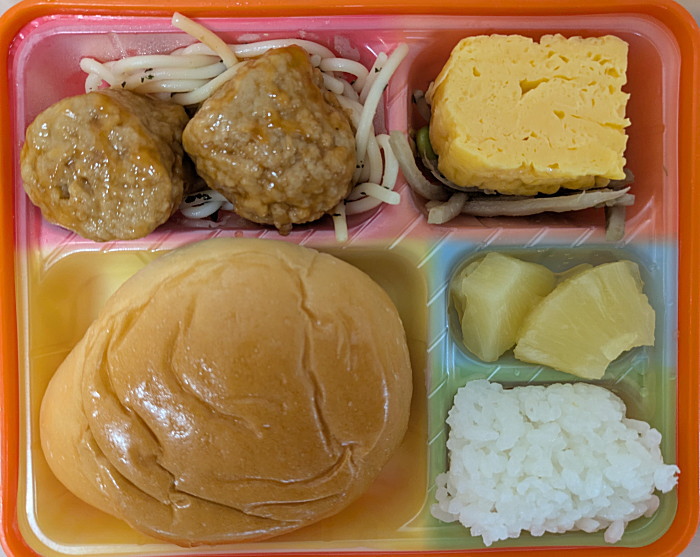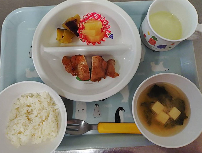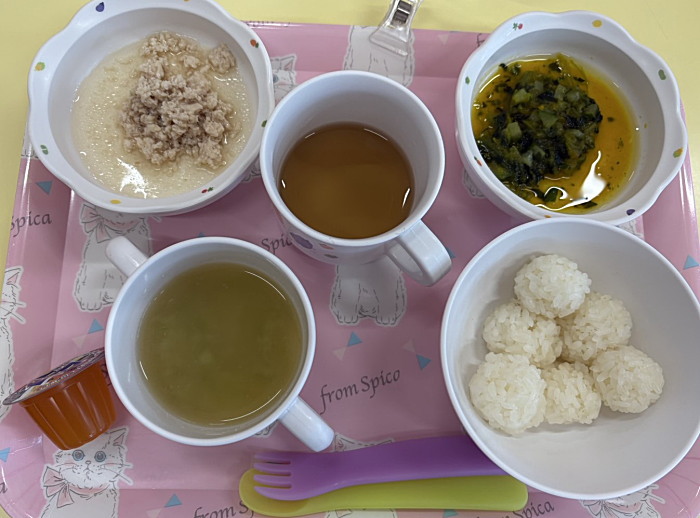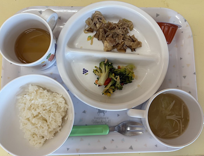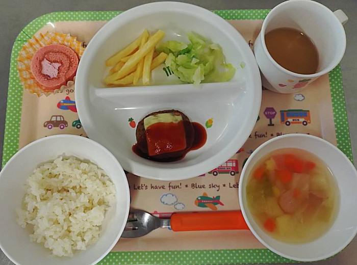 本日は1.2歳児とにこにこ棟給食は同メニューです。下がさくらんぼ組給食です。