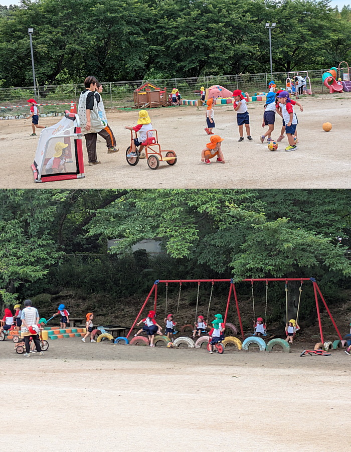 朝、整然とセットされていました。2.3歳児がここでの体操教室を行いました。3歳児以上のクラスはかけっこで園庭1周!おそらく他園に無い試みそして運動能力向上かもしれませんね。