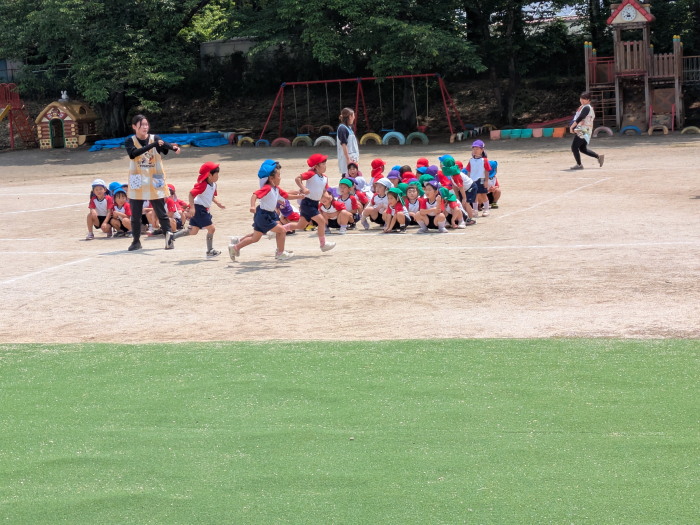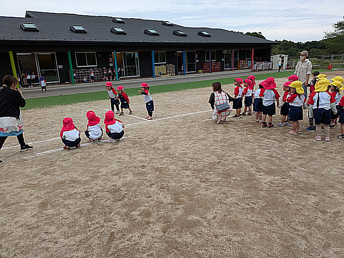 涼しい園庭、年少組がかけっこ。一番であんず組が遊びに来て、もも、さくらんぼ組もたっぷり外遊びを楽しみました。本日は年中組が体操教室でした。