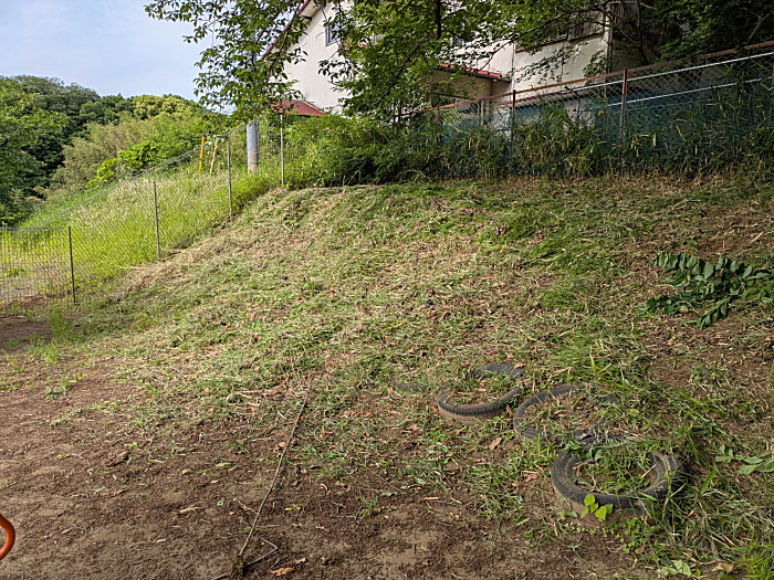 フェンス向こうの背丈ほど伸びていた笹をバッサリ。ヤブ蚊対策、園児たちが少しでも快適に過ごせるよう、草とバトルしています。ビフォーアフター!これが快感。(笑)何れ向こう側も退治してやります。